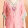 Embroidered Kaftan Palazzo Set, Pink, V-Neck with Fringe Details, Floral Embellished
