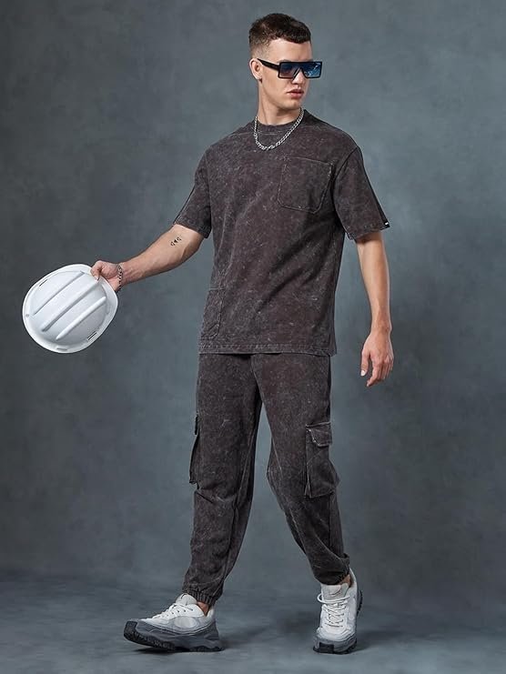 Heavy Duty 1.0 Men’s Self Design Oversized Fit Half Sleeve Round Neck Terry Acid Wash Co-Ordinates T-Shirt