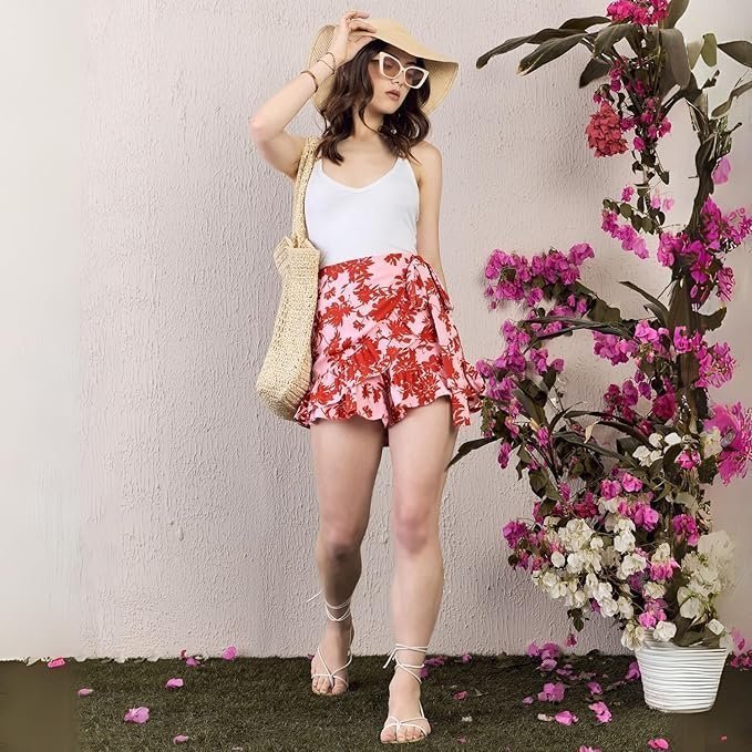 Women Floral Printed High-Rise Waist Tie-Up Ruffled Wrap Mini Skirts