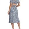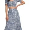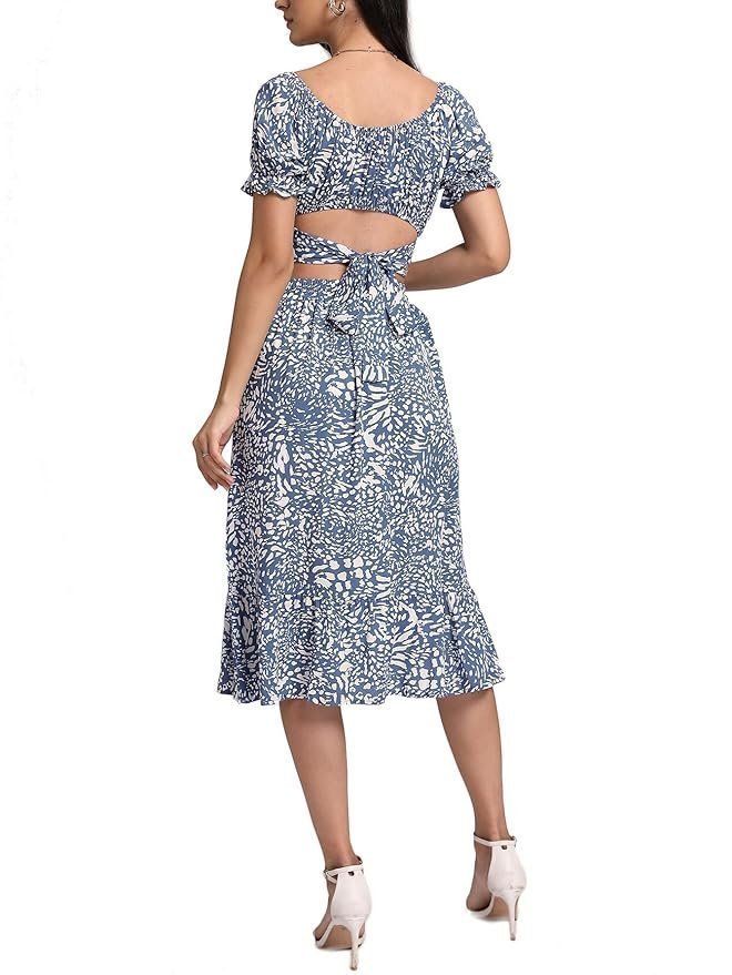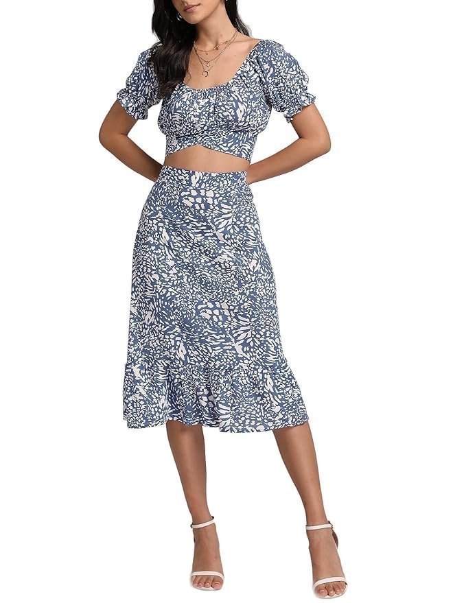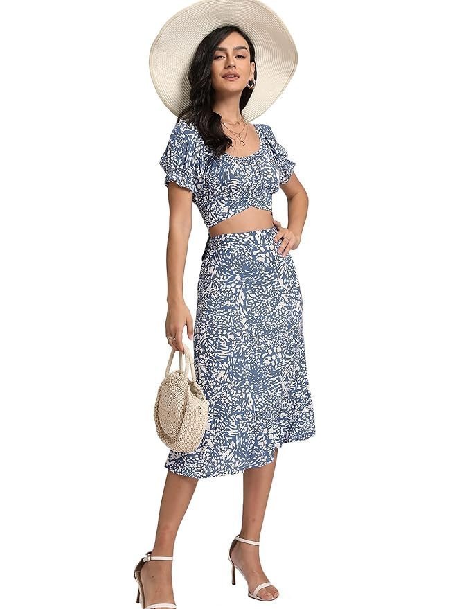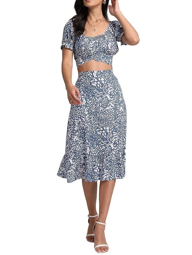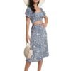 Women’s 2 Piece Outfits Floral Self Tie Knot Crop Top and Midi Skirt Set, 2#blue, Small