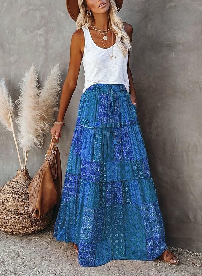 - VINTAGE BOHO FEATURES: Long skirts for women, summer fall pleated skirts, elastic waistband, adjustable tie, high waisted skirts for women, boho vintage trendy type, fashion and casual. Women’s skirts with two deep side pockets, easy to carry mobile phones, keys. Loose fit, flowy skirt, chic, perfect for summer, fall, winter.